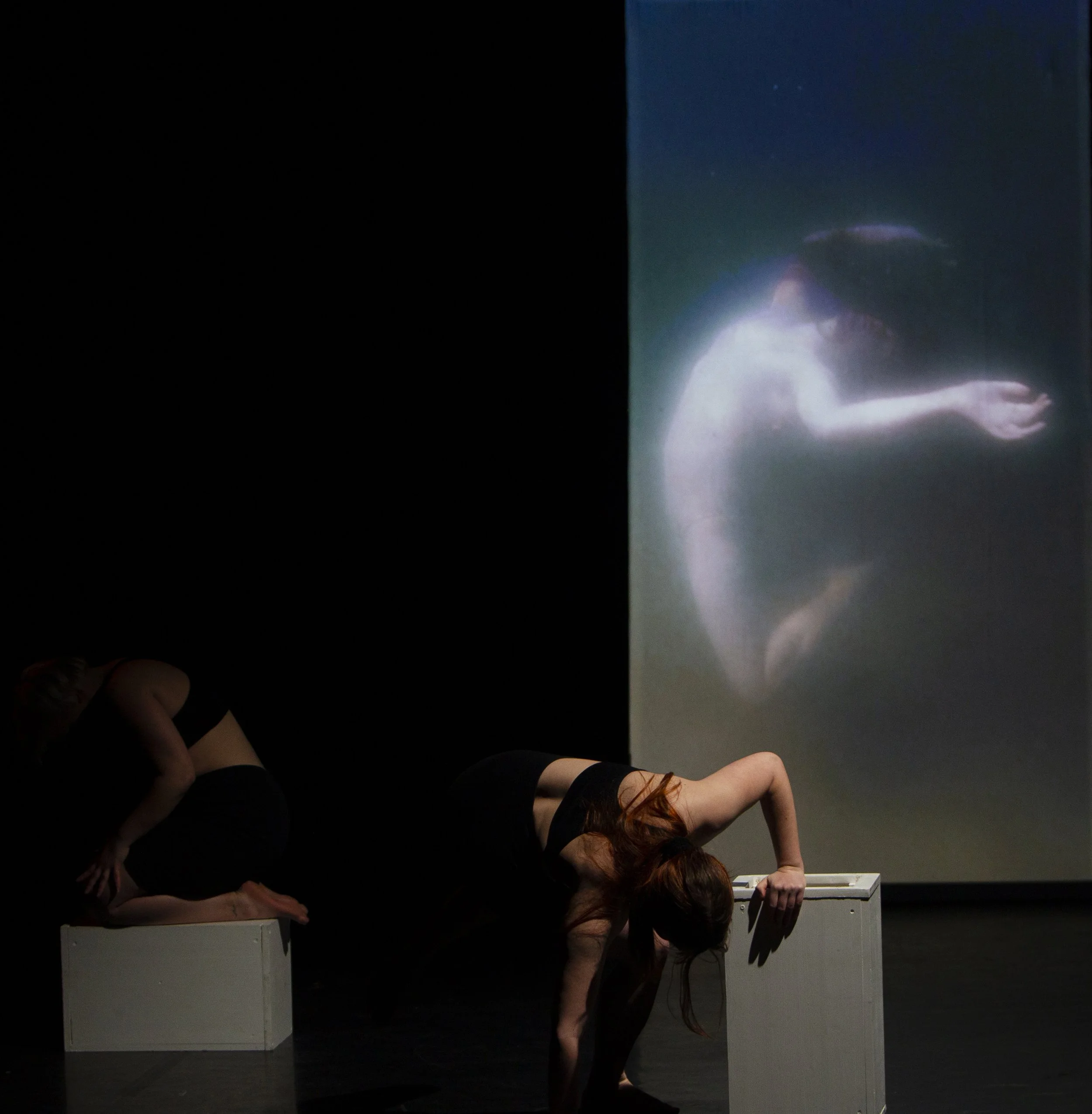 The stage design is deliberately minimal and symmetrical. It consists of two cubes and a projection screen (150 × 300 cm), which together form the suggestion of a third cube. This spatial structure functions as a metaphor for the mind: enclosed, repetitive, and inescapable. The cube becomes a mental architecture.